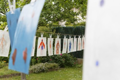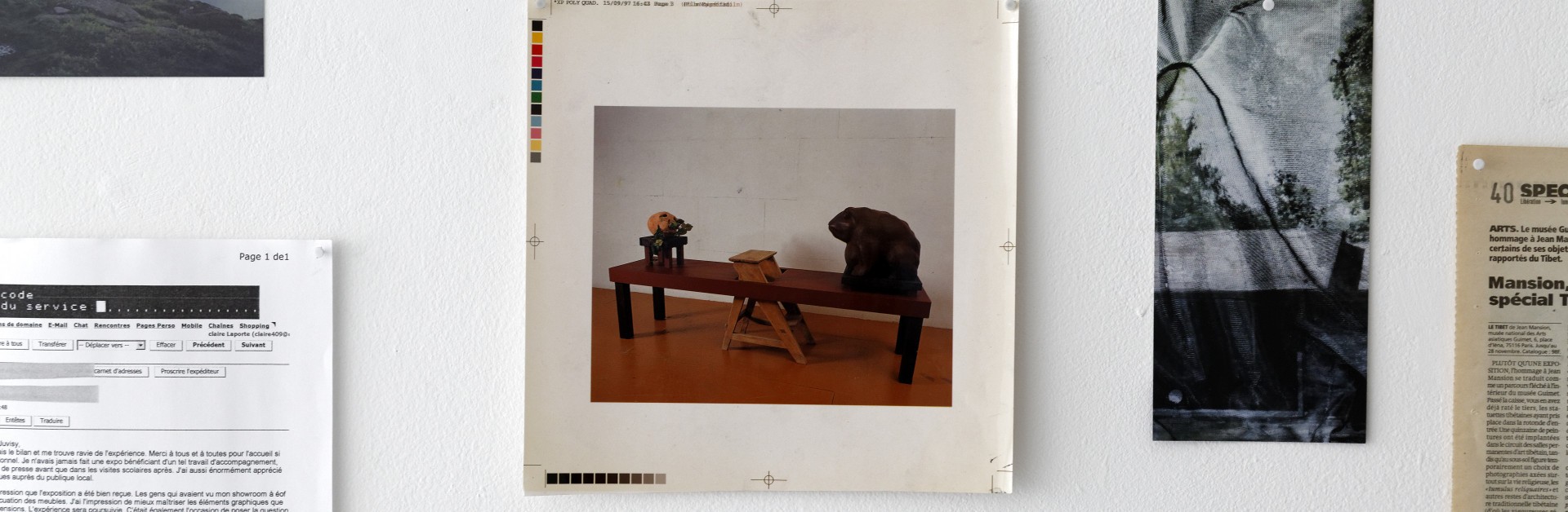 Dans cette exposition à trois voix contemporaines, se côtoient, se mêlent ou s’entrechoquent les différentes temporalités de l’histoire de l’École et Espace d’art Camille Lambert. Ces traces du passé, qui constituent autant de promesses pour l’avenir, sont évoquées à travers certaines archives du lieu (correspondances, photographies, ektachromes, diapositives, croquis, cartons d’invitation, factures en francs et autre bons de commande pour des matériaux désormais oubliés…). Ces divers documents, qu’ils soient disposés, au même titre que les oeuvres, sur les murs de la galerie ou bien présentés sous forme numérique, permettent à chacun, visiteur assidu ou nouveau venu, de se rappeler ou de s’imaginer la vie d’un centre d’art, des prémisses de l’organisation d’une exposition jusqu’au moment festif du vernissage. Venant éclairer ces archives visuelles, des entretiens filmés avec la complicité de l’artiste Marie-Camille Orlando, leur font écho dans l’espace d’exposition. Autant de récits subjectifs confiés par diverses personnalités liées à la structure (joyeux voisins amateurs qui ont partagé les moments clé de l’histoire de l’Espace d’art, artiste ayant exposé dans et hors les murs comme avec les enfants des ateliers, ancien élève devenu créateur, libraire passionné et partenaire occasionnel ou encore tout jeunes élèves de l’école), qui composent donc de nouvelles archives, pour demain ! Et l’ensemble de ces voix résonnent ainsi avec une autre, celle de la mémoire.