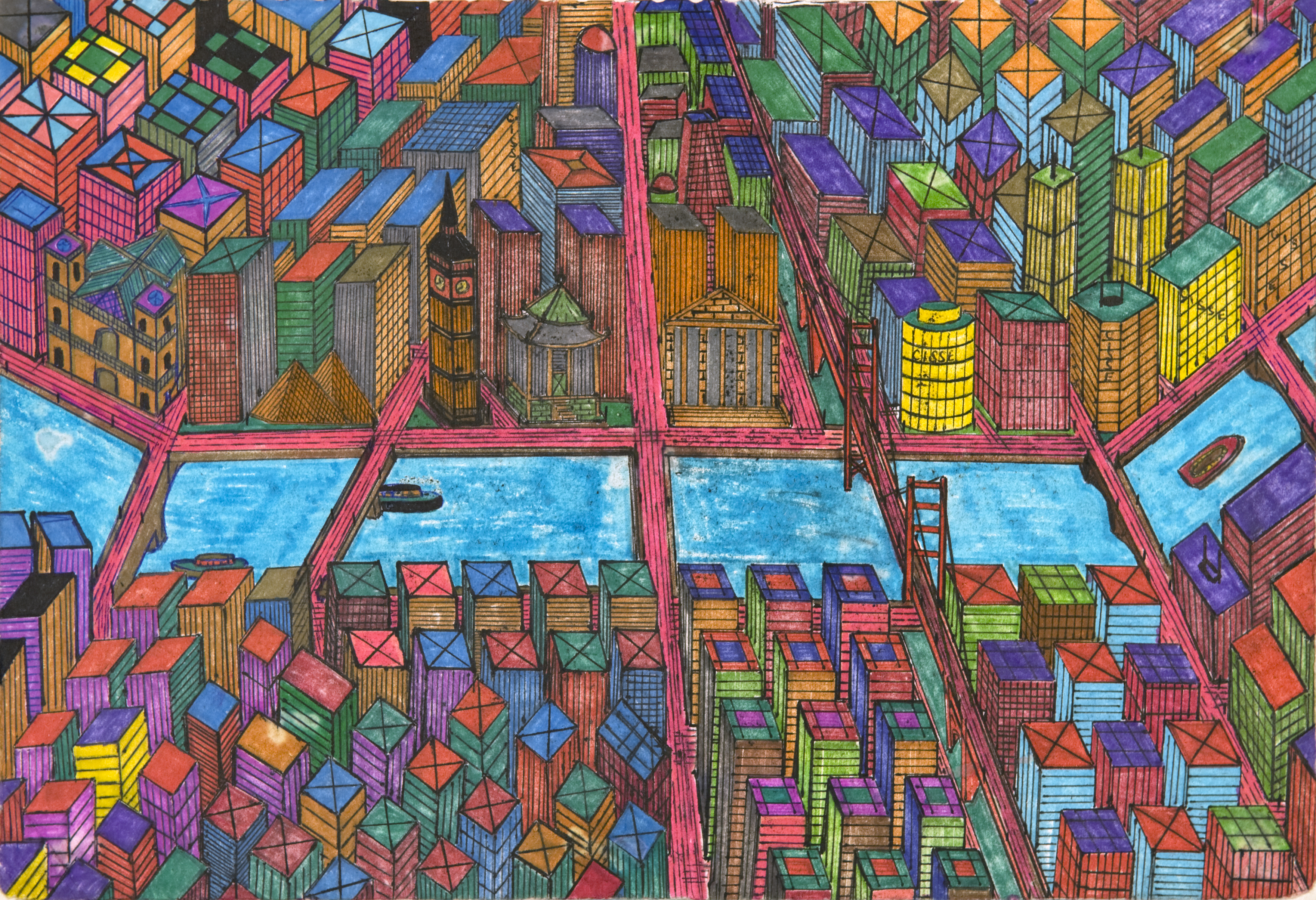 Toutes les villes que dessine Mamadou Cissé sont ses villes. Si nous pouvons y reconnaître les grands axes de New York, ou quelques édifices phares tels que la Tour Eiffel, l’Opéra de Sydney ou le Transamerica Pyramid de San Francisco, les paysages urbains de Mamadou Cissé se construisent dans son imaginaire et représentent sa quête de la cité idéale. Vue du ciel et élaborée dans les moindres détails, la géométrie ordonnée de ses villes peut faire penser au plan de Paris dit « de Turgot », dessiné par Louis Bretez dans les années 1730, ou, plus près de nous, aux peintures de l’artiste américaine Yvonne Jacquette, qui représentent de spectaculaires vues nocturnes aériennes sur de grandes villes, notamment New York. Mais les dessins de Mamadou Cissé ne révèlent pas le souci d’exactitude réaliste que présentent le plan « Turgot » ou les tableaux de la peintre américaine. N’utilisant que du feutre sur papier, et parfois un peu de gouache, il crée un univers urbain rythmé par des couleurs vives et fantaisistes. Ses villes se distinguent par la présence de signes ou de graphismes personnels, tel que l’inscription de son nom sur le toit d’un immeuble, ou l’intégration des « gribouillages » de son jeune fils à l’œuvre. Artiste autodidacte d’origine sénégalaise, Mamadou Cissé a toujours dessiné, notamment des personnages de bande dessinées et de dessins animés. Impressionné par les vues aériennes sur les grandes villes dans les films américains qu’il a apprécié dans sa jeunesse, il avoue qu’il rêve toujours de survoler New York en hélicoptère.