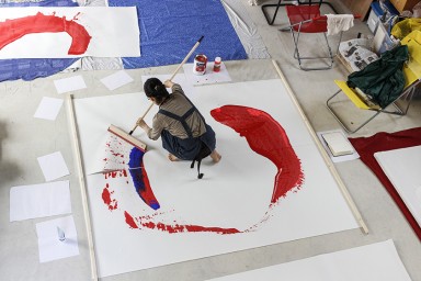 Originaire du Japon, Mari Minato étudie d’abord la peinture traditionnelle japonaise à Kyoto avant son arrivée en France où elle intègre les Beaux-Arts de Paris. Elle aime à se référer à des civilisations aujourd’hui disparues, étrusques, hommes de Néandertal, ainsi qu’à l’histoire des territoires où elle est invitée à intervenir. Pour cette exposition, elle portera plus particulièrement son attention sur le peuple magdalénien qui vécut en région francilienne, en lien avec les sites d’Étiolles en Essonne et de Pincevent en Seine et Marne, témoins d’une vie préhistorique proche de la Seine. Son geste pictural coloré se déploie tout autant sur des surfaces murales que sur des feuilles de papier, sur de la céramique ou dans des carnets. Quel que soit le support, l’importance donnée au blanc demeure fondamentale dans l’équilibre de ses œuvres, renforçant la présence du signe. L’artiste a poursuivi son travail de la terre dans les mois précédant l’exposition, en travaillant sur le site au sein des ateliers de l’École d’art.