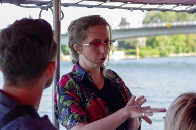 Cette performance se déroule sur la péniche Bali qui remonte la Seine de Paris à Juvisy-sur-Orge. Elle est conçue comme un conte flottant, prenant appui sur le paysage de la croisière, de la BNF à Chinagora en passant par le centre aquatique d’Alfortville. Clélia Barbut et Charlotte Hubert emploient la cartographie