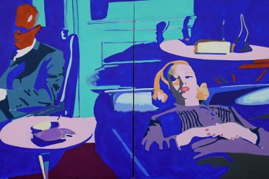 La peinture de Regine Kolle se joue dans l’instant. Ses personnages nous font face, nous regardent même parfois avec une certaine surprise ou défiance. Qui sommes-nous ? La narration qui se joue sur ses toiles nous plonge dans un univers urbain, très coloré. De ses gestes larges et rapides, l’artiste dresse des portraits dessinés qui peuvent investir les murs ou encore prendre vie sous la forme de film d’animation.