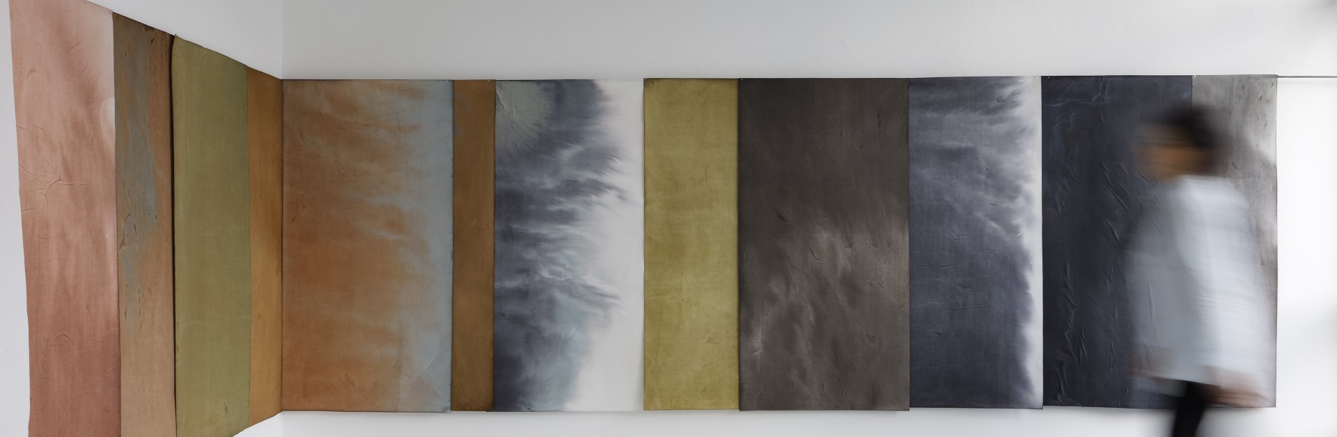 Le travail de Natalia Jaime-Cortez se déploie, ou plutôt se déplie, et relève d’un engagement corporel de l’artiste dont les papiers suspendus viennent dessiner des lignes dans l’espace. Le travail de la couleur est ici distancié puisque que cette dernière apparaît grâce au trempage d’un papier, inlassablement le même, dans des bains d’encre. Le geste se répète, toujours dans une absence d’outil. La main de l’artiste vient déchirer ces supports fragiles avant de les superposer dans des compositions dont émanent une subtile fragilité.